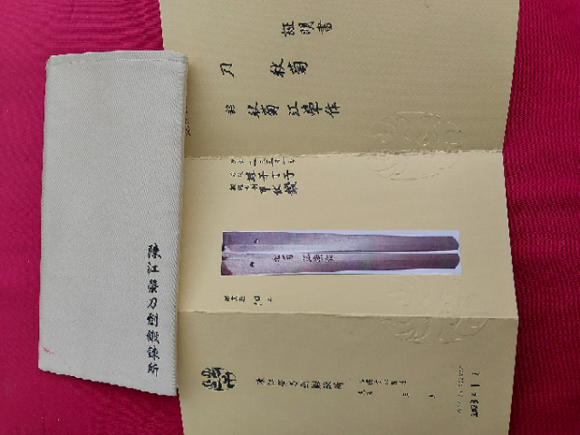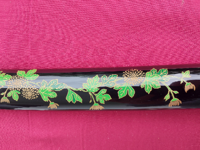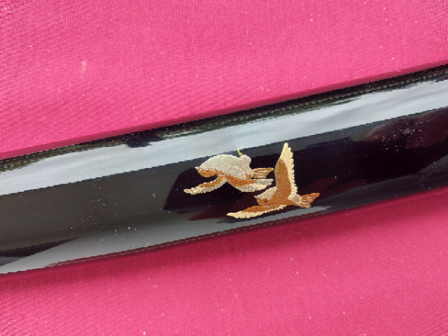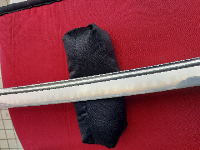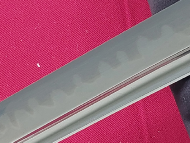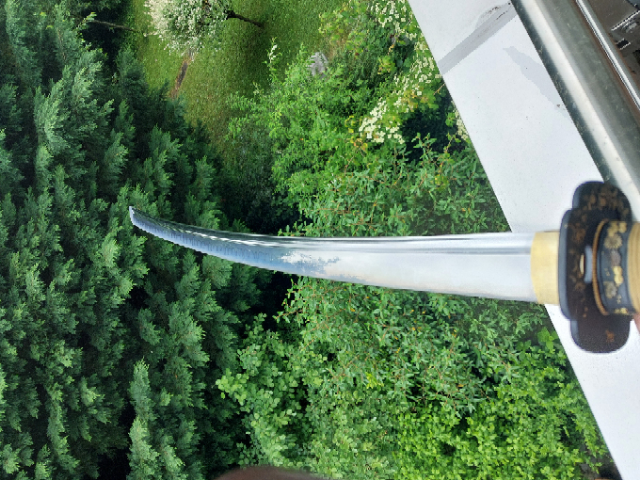 Wunderschönes Katana aus einer limitierten 10er Produktion von Sakae Forge. Tamahagane-Kobuse Klinge mit Gunaome-Choji-Hamon und Bohi. Die Koshirae sind von allerbester Qualität und die wundervoll verzierte Saya ist für sich genommen ein wahres Kunstwerk! Ich trenne mich wirklich nur schwer davon, aber ich muss meine Sammlung umbauen. In der Bohi sind wenige, kaum wahrnehmbare “Ware”. Aufbrüche, die beim Schmieden vorkommen können, aber das Schwert in seiner Funktionalität nicht einschränken. Ehrlich, ein klasse Schwert!