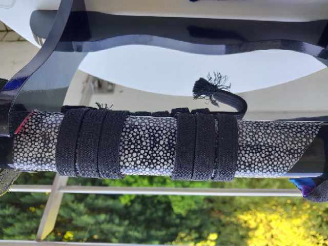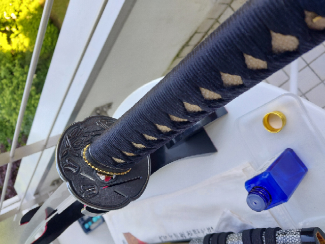 DNH7 Hartstahl, aufgeschmiedete Habaki aus Kupfer, alle anderen Beschläge aus Eisen. Bohi und Sashikomi-Politur. Seidenwicklung und echte Rochenhaut unter der Tsuka und auf der Saya.