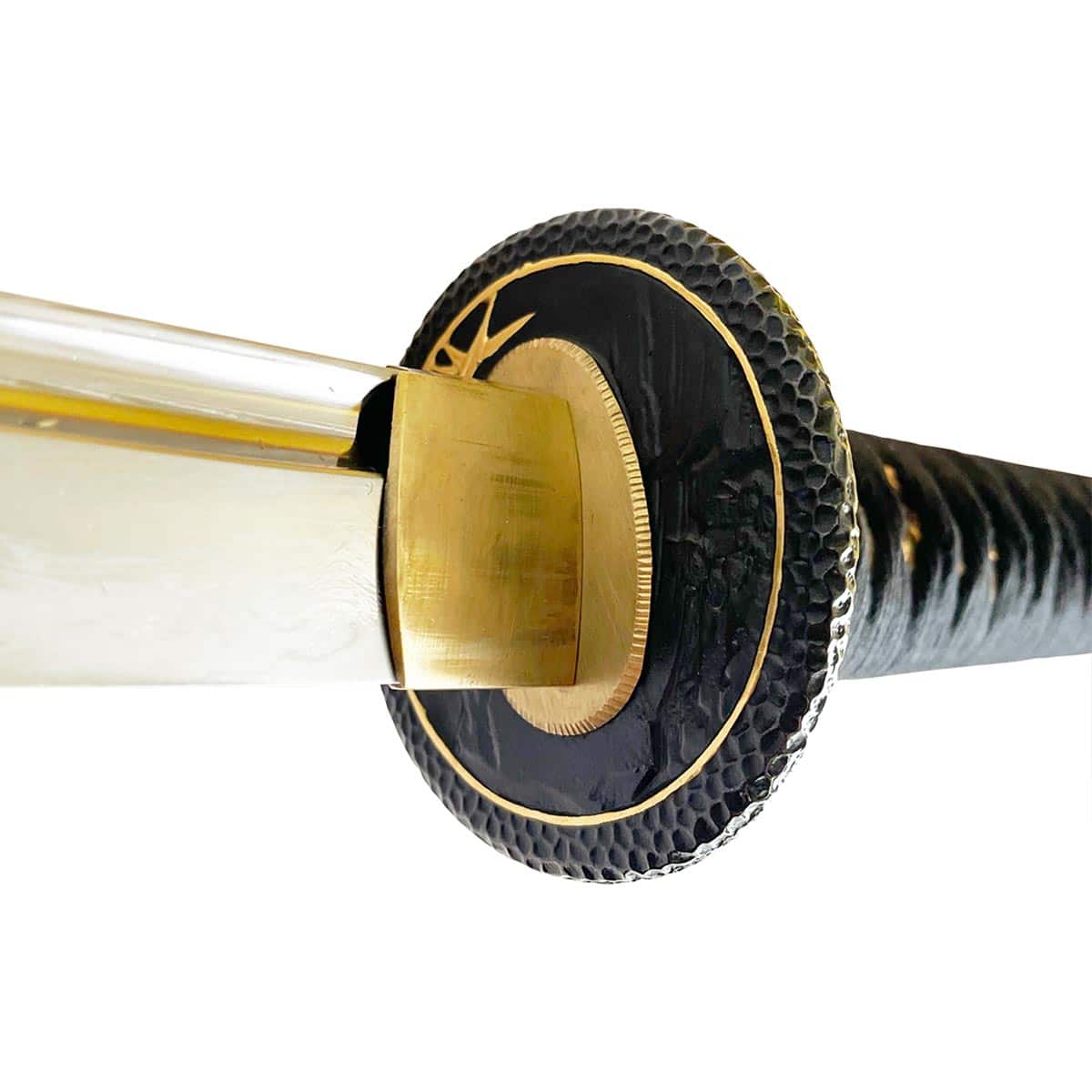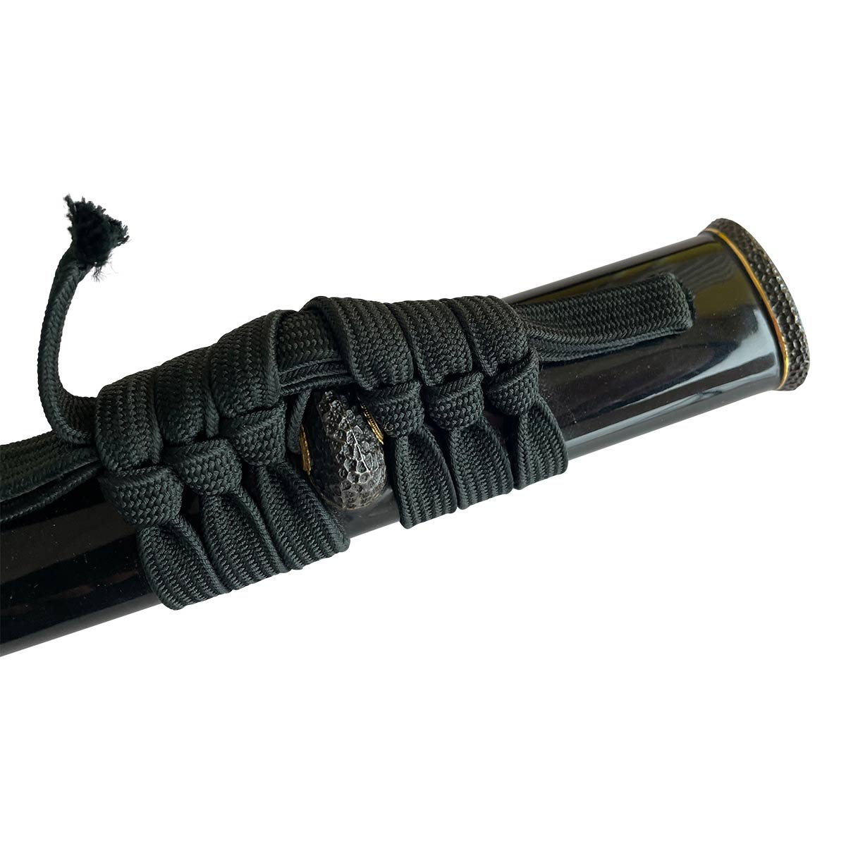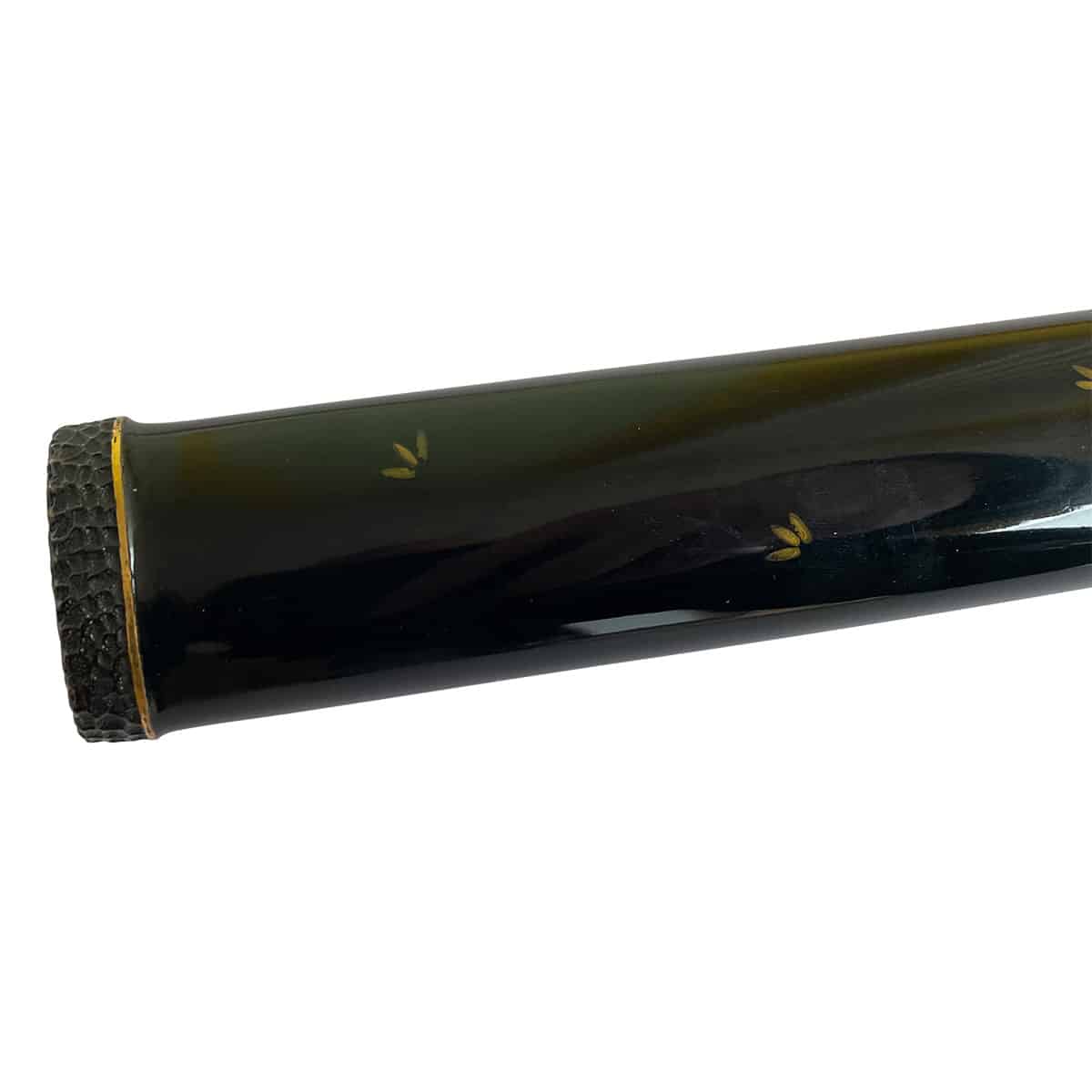 Die Saya ist schwarz hochglanzlackiert mit eingelegten Bambusblättern aus Messing. Die Endstücke (Koiguchi und Kojiri) sind aus geschwärztem Eisen mit Ishime Struktur hergestellt und mit goldfarbenen Details verziert, auch die Aufnahme für das Sageo-Band (Kurigata) ist aus Metall und im gleichen Stil gehalten.