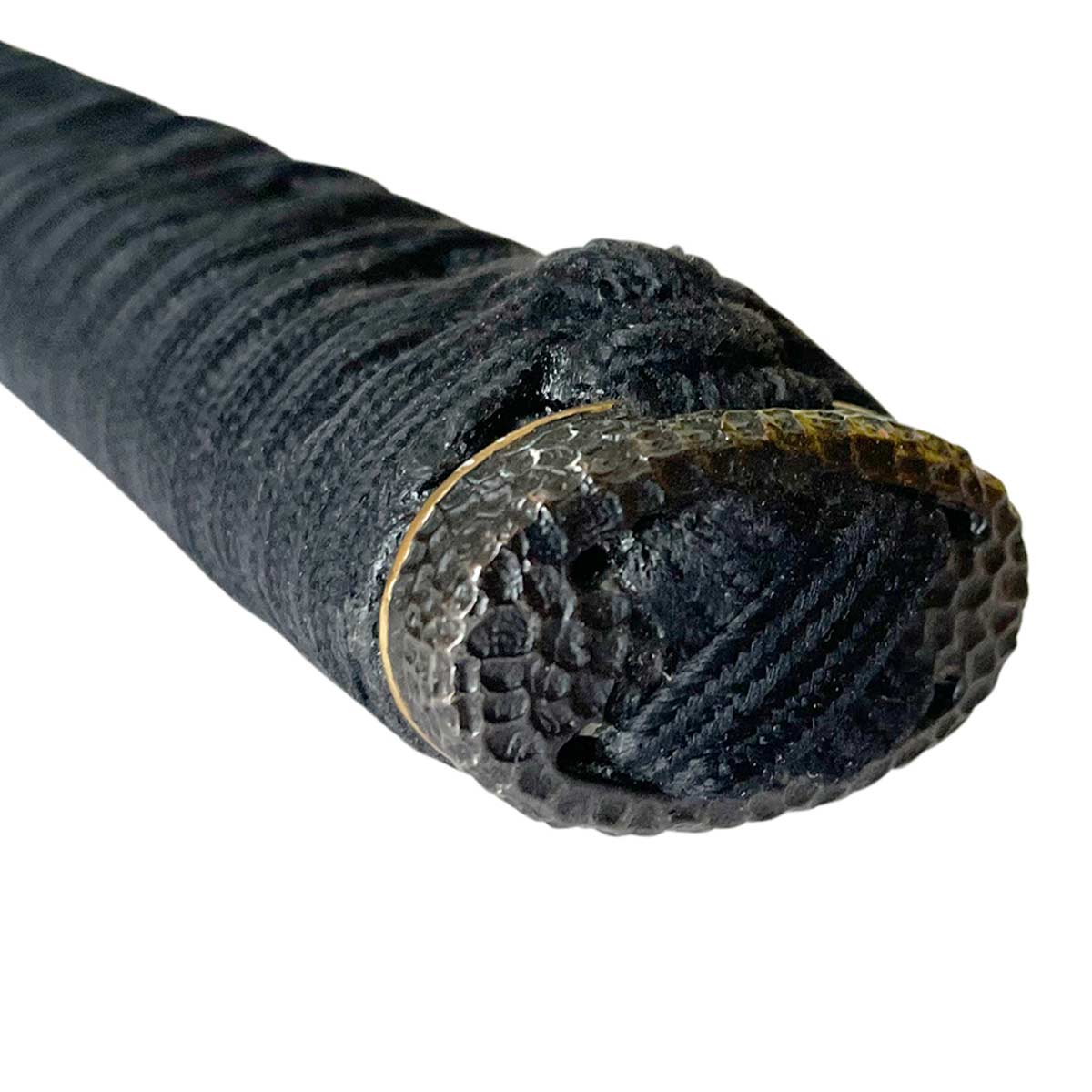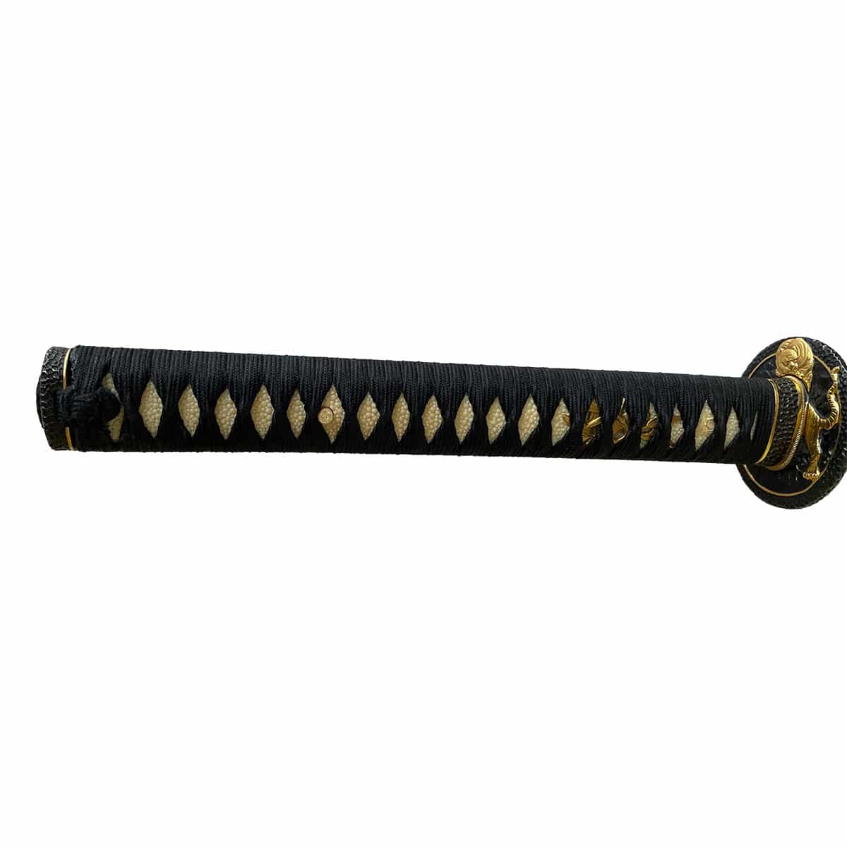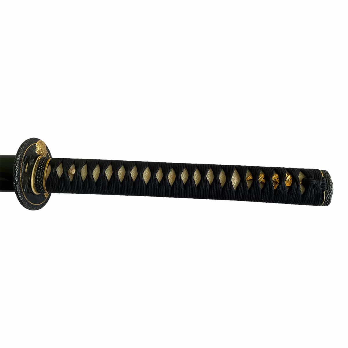 Die Saya ist schwarz hochglanzlackiert mit eingelegten Bambusblättern aus Messing. Die Endstücke (Koiguchi und Kojiri) sind aus geschwärztem Eisen mit Ishime Struktur hergestellt und mit goldfarbenen Details verziert, auch die Aufnahme für das Sageo-Band (Kurigata) ist aus Metall und im gleichen Stil gehalten.