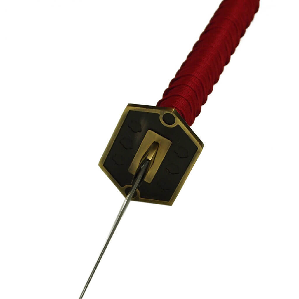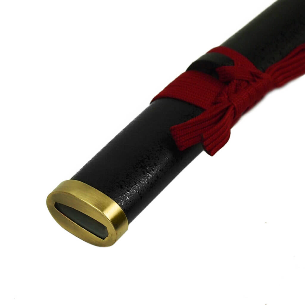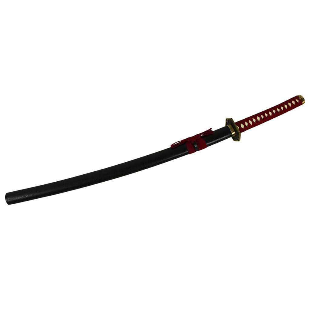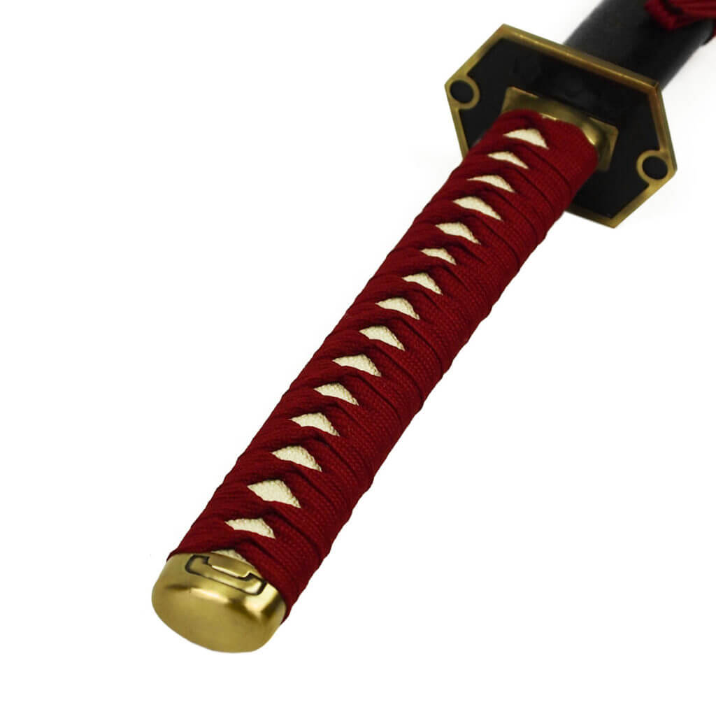 Hinamori Momos Schwert, das genau nach dem Vorbild der Serie gefertigt wurde. Inklusive dem roten Band um den Schwertgriff. Die Schwertscheide ist schwarz lackiert, mit einer Oberflächenstruktur auf der sich keine Fingerabdrücke bilden.