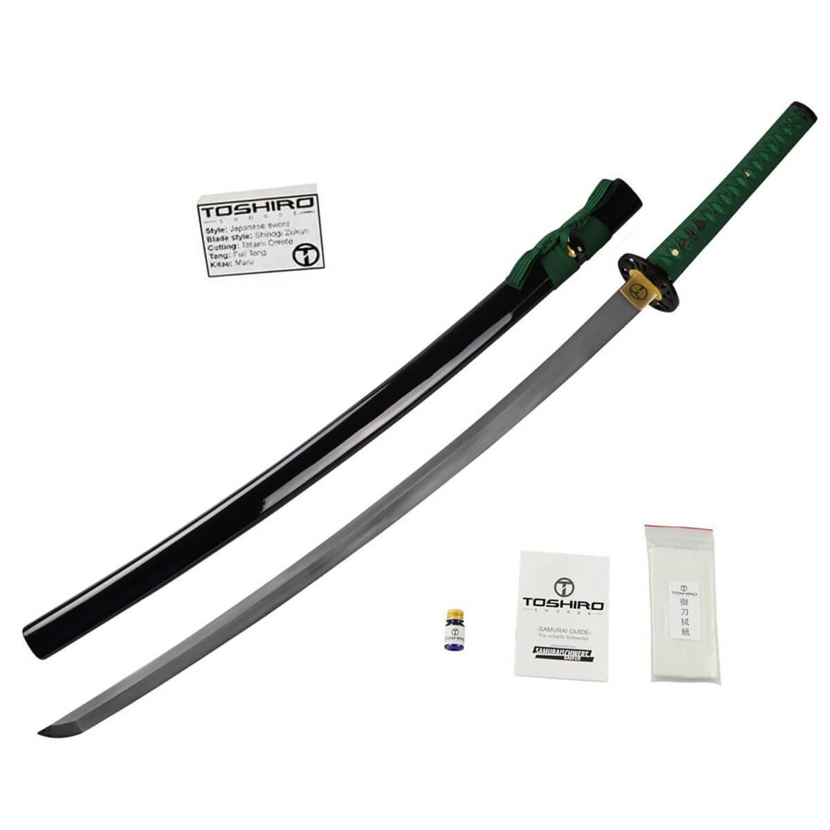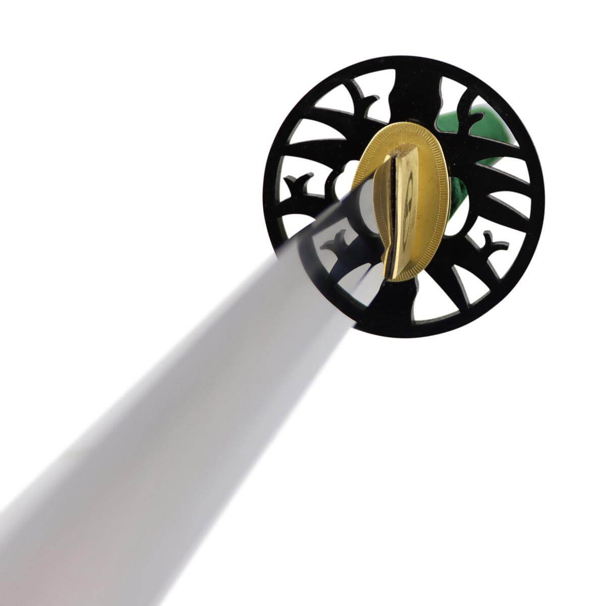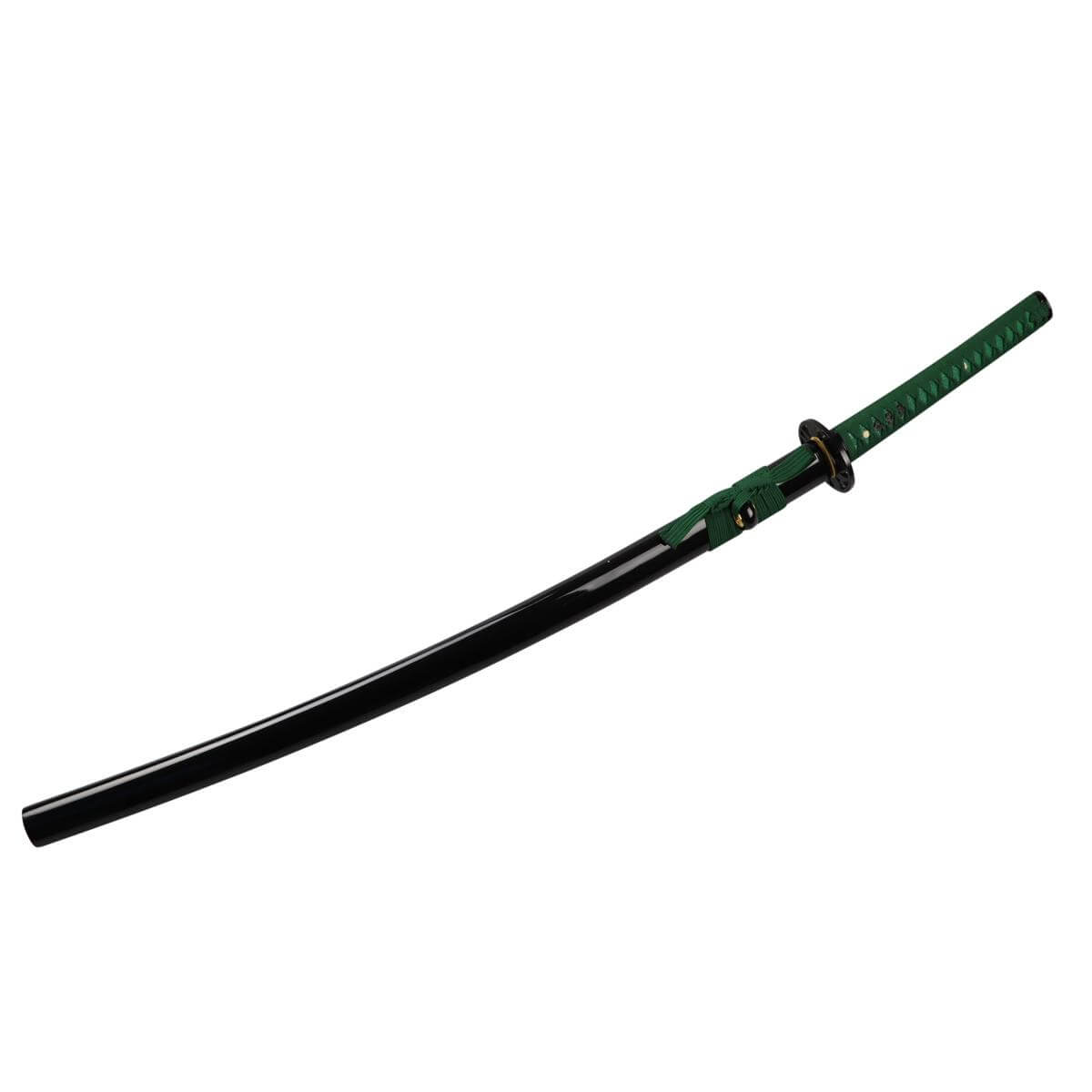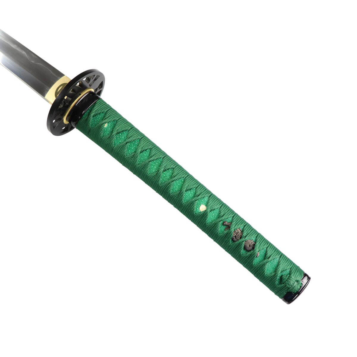 Ist aus Massivholz gefertigt, es wurden Einlagen aus echter, grün gefärbter Rochenhaut verwendet. Die Rochenhaut ist komplett um den Griff gewickelt und das grüne Griffband in traditioneller Weise gewickelt.