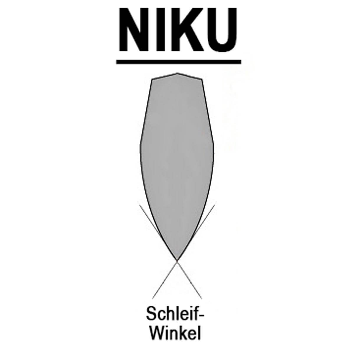 Klinge mit Niku!: Die Klinge hat einen balligen Schliff, wie auf dem Schaubild bei den Produktbildern gezeigt. Durch den steileren Schleifwinkel ist die Klinge etwas weniger scharf, aber hält dafür wesentlich höhere Belastungen aus (ähnlich wie eine Axt).