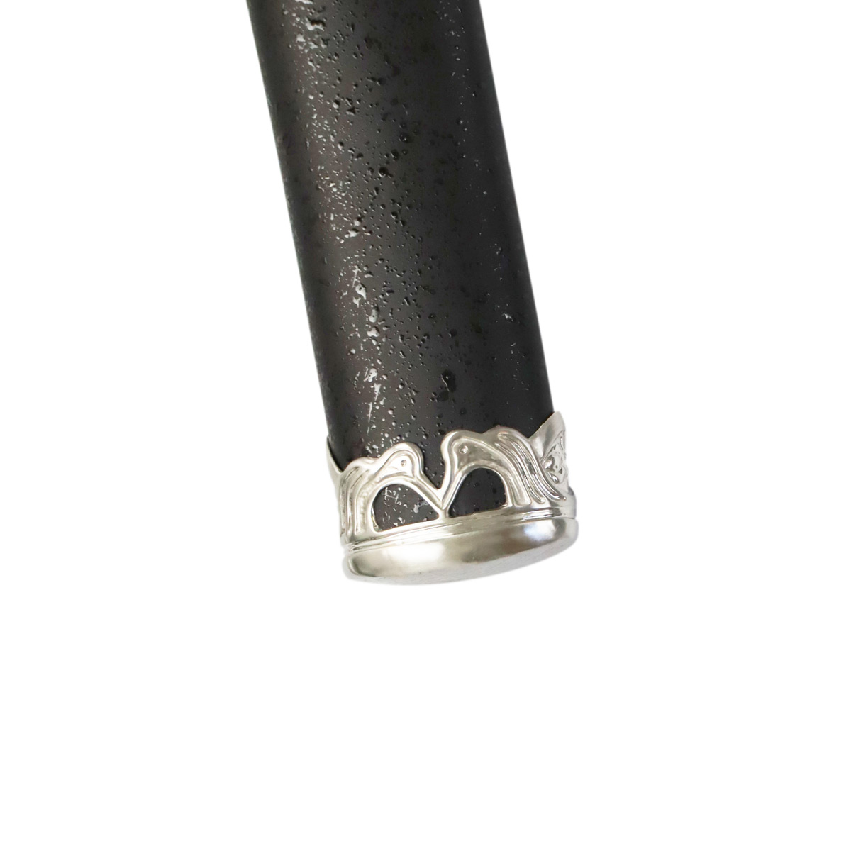 Die Schwertscheide ist mit einem Band aus Rattan verziert. Darüber und über den Rest der Schwertscheide wurde mit Ishime Technik lackiert, die eine Tropfenoptik auf der Schwertscheide hervorruft.